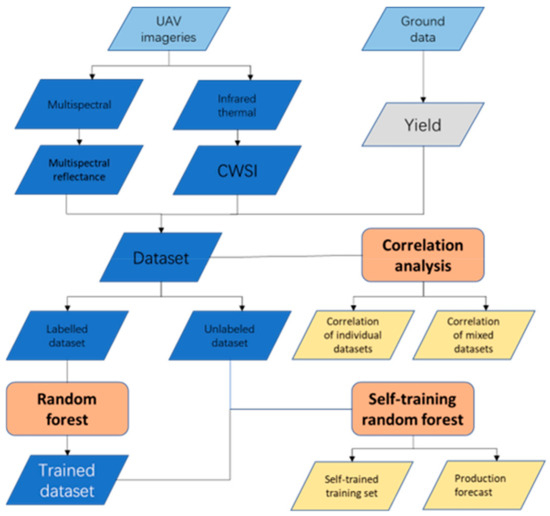 The high cost of the data annotation process presents a challenge for many tasks, making it difficult to obtain strong supervisory information, such as all-real labels [14]. The key contribution of this article lies in the combination of both advantages: utilizing a small amount of labeled data and improving the accuracy of winter wheat yield predictions. To this end, this article proposes a self-training random forest semi-supervised algorithm for yield prediction. In the experiments, we utilize the multispectral reflectance and water stress index of wheat obtained by a drone equipped with a multispectral camera, alongside a small amount of labeled yield data. The unlabeled wheat multispectral data are annotated to expand the training set, and the newly generated training set is employed for yield prediction.