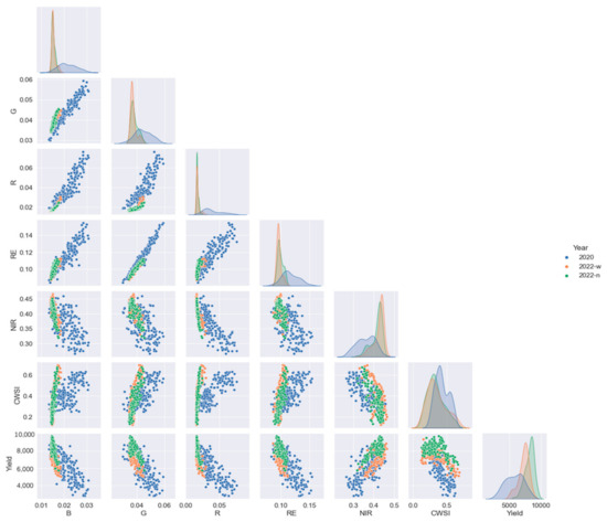 Analysis of the data under different irrigation amounts revealed that the correlation between red light reflectance and winter wheat yield reached its highest level at r = −0.80, occurring in 2020. Conversely, the correlation involving NIR reflectance was the weakest among the tested indices, with a coefficient of r = 0.6, observed in both 2020 and 2022. Additionally, the reflectance for blue light, green light, and red edge and the water stress index all shared a consistent correlation of r = −0.7, noted in both years.