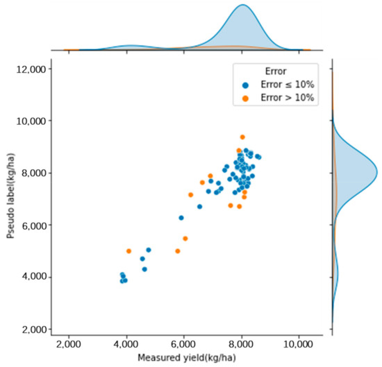 Through extensive experimentation, a flexible δ strategy was established: for the first three rounds, δ was set to 0.05 minus 0.01 for each round, and afterwards, it was adjusted to 0.015, with a cap of 50 rounds for training. This methodology resulted in 84 trusted pseudo labels, 72 of which had an error of less than 10%, as illustrated in Figure 6. The distribution of these labels ranged from 3000 kg/ha to over 9000 kg/ha, predominantly exceeding 7000 kg/ha. Overall, the findings highlight the importance of selecting an appropriate δ value to optimize the accuracy of pseudo labels and the efficiency of the learning process, with higher δ values yielding more but less accurate labels and lower δ values providing fewer but more reliable ones.