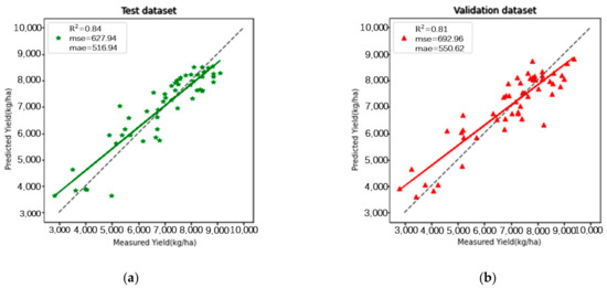 After self-training, 84 pieces of data were added to the training set. Based on the expanded training set, a test with an = 0.84, RMSE = 627.94 kg/ha, and MAE = 516.94 kg/ha was conducted on the test dataset, a verification with an = 0.81, RMSE = 692.96 kg/ha, and MAE = 550.62 kg/ha was conducted on the validation dataset, as shown in Figure 8.