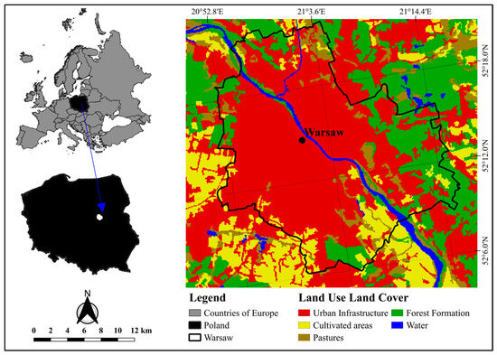 The research was undertaken within the urban boundaries of Warsaw, the capital city of Poland, located in the central-eastern part of the country (Figure 1). Warsaw is positioned around 300 km from the Carpathian Mountains and roughly 260 km from the Baltic Sea. Encompassing an area of 517 km2, the city is home to a population exceeding 1,744,000 inhabitants [41,42].