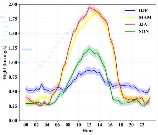 Figure 3 illustrates the average diurnal cycle of the PBLH for each season in Warsaw. During winter (DJF), the boundary layer remains the shallowest of all seasons, reaching just under 1 km between 12 and 14 h. This is due to weaker solar radiation, leading to reduced surface heating and less turbulent mixing. In spring (MAM), the PBLH increases noticeably, reaching around 1.7 km in the early afternoon (14–16 h). In summer (JJA), the highest PBLH is observed, peaking at 2.0 km during the same period, driven by higher surface temperatures and strong convective turbulence. In autumn (SON), the PBLH follows a similar daily cycle but with slightly lower heights, reaching 1.2 km, reflecting the decrease in solar radiation and surface cooling that signals the transition to winter.