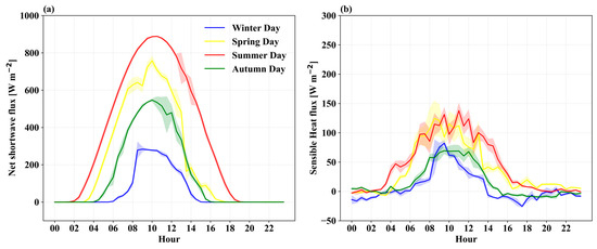 The temporal evolution of (a) net shortwave radiative flux (W m−2), measured by the surface radiation system. (b) Estimated sensible heat flux (W m−2) using ECOR. Standard deviation (shaded) is shown for the days under study.