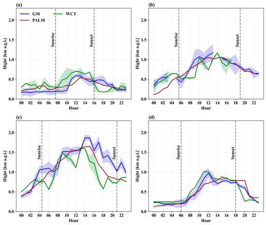 The PBLHs derived from lidar signals through the application of GM and the WCT method were compared with the PBLHs obtained through PALM model simulations (Figure 6). The analyses were conducted for all the examined cases, revealing a diurnal cycle in the PBLHs, which is typically associated with the variation in solar radiation throughout the day. Therefore, a strong seasonal variation was noted in the PBLH values, which is associated with the change in solar position and zenith angle [55]. This sun–earth relationship position results in different times of sunrise and sunset (which generate positive fluxes), as observed in Figure 4a.