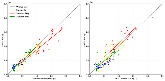 Scatterplots of PBLHs derived from lidar using GM (a) and WTC (b) with the PALM model in the city of Warsaw, Poland for four days of 2021.