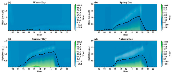 The temporal progression of vertically averaged sensible heat flux () (W m−2) obtained using the PALM model for Warsaw for four representative dates of 2021: (a) Winter Day, (b) Spring Day, (c) Summer Day, and (d) Autumn Day. The dashed line indicates the altitude at which the flux reaches zero ( = 0).
