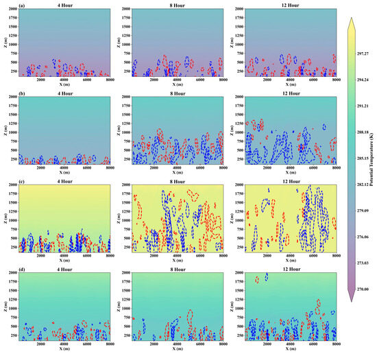 The PALM model is constructed on the premise of spatially averaging turbulent fluctuations, segregating them into large- and small-scale eddies through the application of a specific filter function. While the simulation directly captures the features of large-scale eddies, the model parameterized the behavior of small-scale eddies. The equations governing mass, energy, and moisture conservation are filtered to correspond to the grid size, with the omission of molecular diffusion and radiation processes. The temporal discretization is accomplished through the utilization of the third-order Runge–Kutta time-step scheme [67].