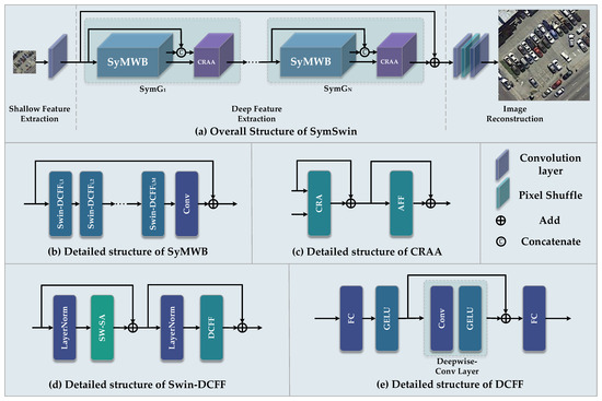 Eventually, the high-resolution image is generated by passing the aggregated deep feature FD and shallow feature FS through an image reconstruction module, which involves groups of convolutions and pixel shuffle operations [37]. The reconstruction process can be denoted as: