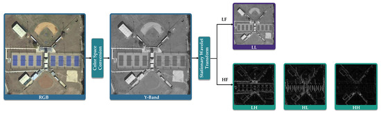 Explicitly, given an RGB domain image , we first convert it into the YCrCb domain to extract luminance information before frequency transformation. What is worth mentioning is that only the luminance feature is required for wavelet transform since color information is less practical in the frequency domain. The process of SWT is illustrated in Figure 4.