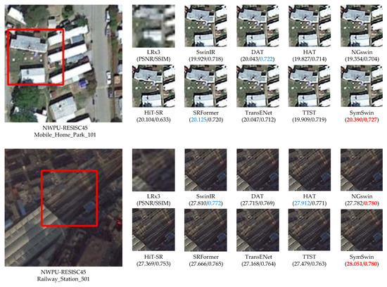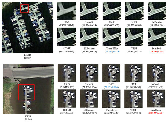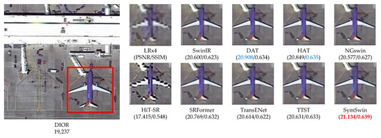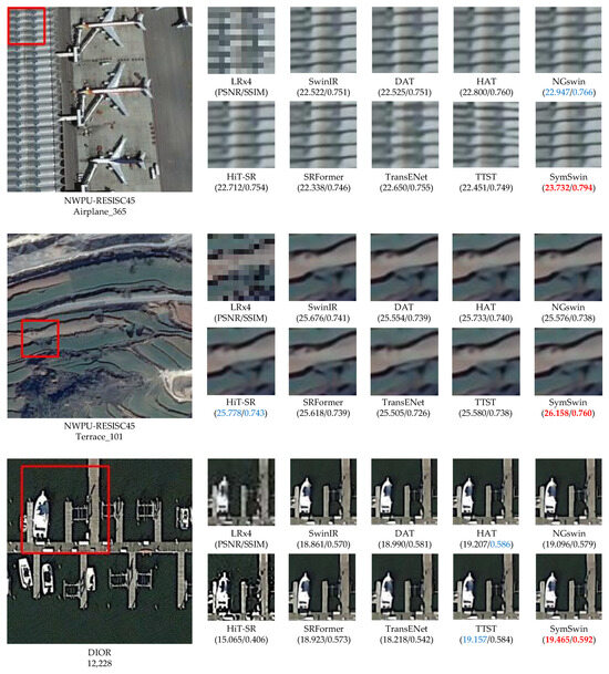 It is easily implied that the presented SymSwin have obvious advantages in PSNR over the other five algorithms among all classes in the ×4 SR task. In scenes containing more complex multi-scale textures and objects, our algorithm achieved more significant improvements compared to those in other scenes. For example, SymSwin outperforms the second-best approach by 0.750, 0.730, 0.610, 0.480, and 0.433 in the “Intersection”, “Parking_lot”, “Airplane”, “Harbor”, and “Freeway” scenes, respectively. However, as for the scenes with flat structure information, such as “Mountain”, “Snowberg”, “Sea_ice”, “Lake”, and “Wetland”, our method only achieved enhancements of 0.100, 0.104, 0.l07, 0.113, and 0.150 separately.