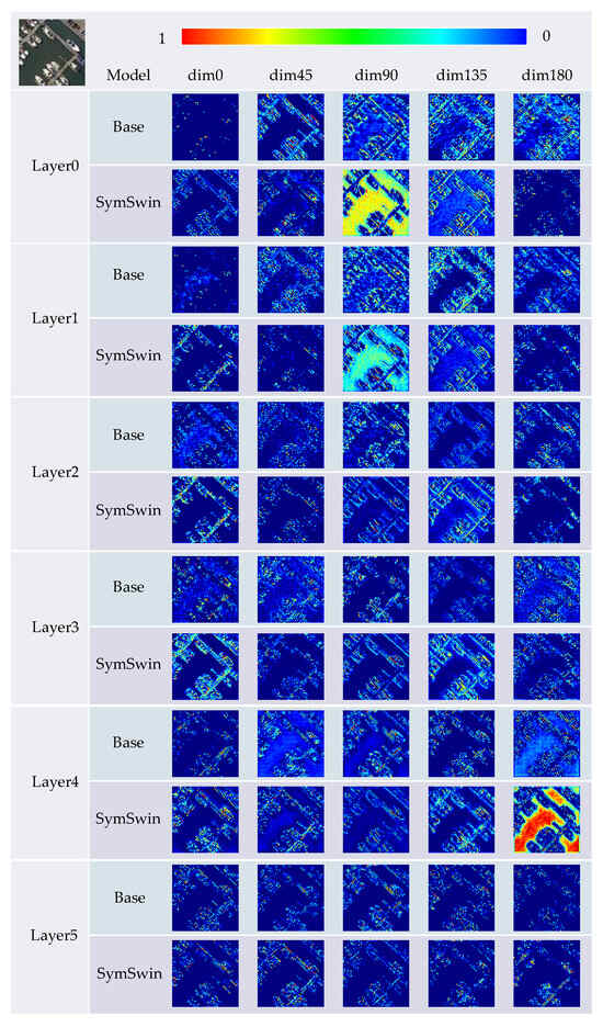 To more intuitively demonstrate the role that integrating multi-scale representations to the feature extraction network plays in the understanding of context, we extracted the outputs of each RSTB [8] and SymG and visualized the feature maps. For the ×4 SR task, considering the reconstruction mechanism of pixel shuffle, we uniformly sampled the feature maps along the channel dimension to produce five attention heatmaps for each, thereby representing the network’s interpretation methodology. The visualization result is depicted as Figure 7.