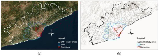 Barcelona Metropolitan Region (BMR, with municipalities). (a) BMR satellite aerial photography; (b) BMR mountain elevation map.
