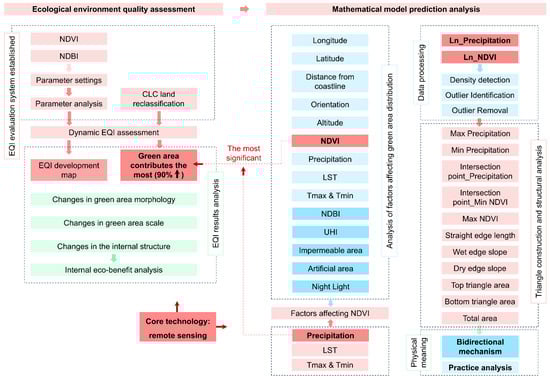 With the rapid development of urbanization, the ecological environment is being degraded. Taking the Barcelona Metropolitan Region as an example, this paper developed an ecological environment quality-assessment system suitable for different times and regions, based on remote sensing, to evaluate the quality of the ecological environment from 2006 to 2018. We also built various ordinary least squares models to analyze multiple variables affecting the ecological environment. Finally, the characteristic triangular spatial structure was used to explain the interaction between the two key variables. The results showed that the ecological quality was unevenly distributed. The largest green space contributed the most benefits but was decreasing and becoming fragmented. NDVI (normalized difference vegetation index) was the most significant natural variable related to the distribution of green space. Precipitation was the most closely related climate factor to NDVI. There was a complex two-way interaction mechanism between the two, and its boundary value was getting higher and higher. In conclusion, the environmental quality of the BMR needs improvement. The characteristic triangle can effectively explain the interaction mechanism between precipitation and NDVI. This study deeply analyzes how various factors affect environmental quality from both the global and internal perspectives and provides a scientific basis for urban ecological management and sustainable development.