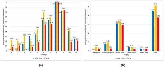 Ecological environment quality-assessment parameters of various types of land use in the BMR during 2006–2018. (a) Ecological environment quality-assessment parameters of various types of land use in the BMR; (b) main categories and overall ecological environment quality-assessment parameters of the BMR. Note: The codes of various types of land use in Figure (a) correspond to Table 2.