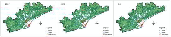 After establishing the ecological environment quality-assessment system for the metropolitan region, we obtained the overall assessment results for each land type and for the BMR (Table 3). Overall, the ecological quality results for the BMR during the study period are impressive, with values consistently above 0.67. Notably, in 2012, the score reached 0.74, the only instance during these three years when it exceeded 0.7. The assessment results for 2018 were slightly lower than those of 2006, but only by 0.02.