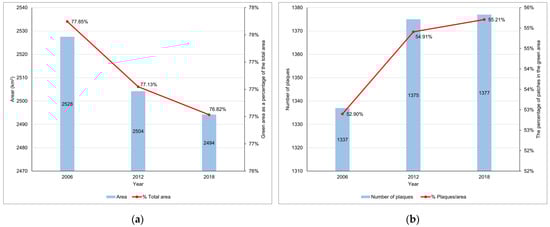 Evolution of the BMR green area and number of plaques from 2006 to 2018. (a) Evolution of the BMR green area and proportion of the BMR area; (b) number of BMR green plaques and proportion of plaques to green area.