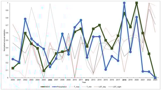 - Having established a clear interaction between NDVI and the distribution of key land uses that influence EQI assessment results, it is necessary to analyze the climatic factors affecting NDVI to uncover the indirect impacts of climate change on ecological quality. For this purpose, a climate database spanning 2000 to 2023 was developed, with the annual average NDVI as the dependent variable and multiple climate data as explanatory variables. The strength of the correlations between these variables was then analyzed.