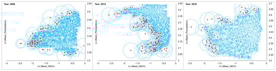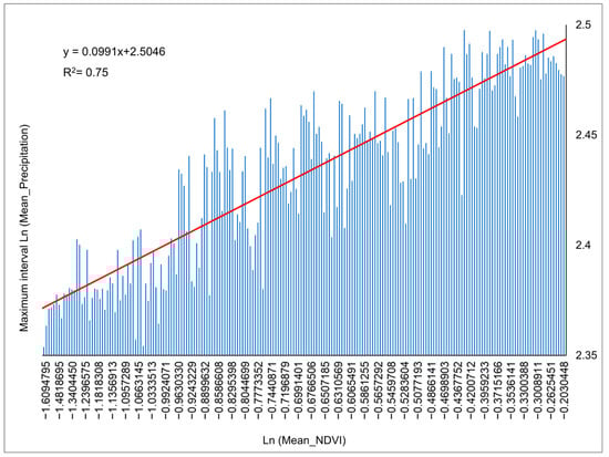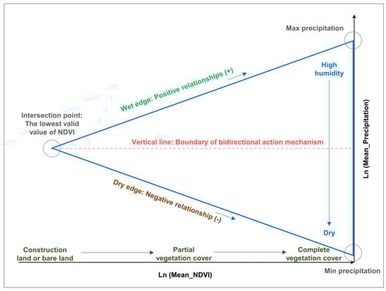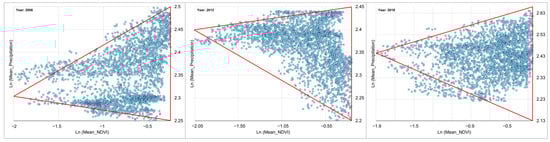 - Firstly, for each year, a precipitation/NDVI scatter plot was established. In order to facilitate the analysis of the physical meaning of each side of the triangle, we used NDVI as the X-axis and precipitation as the Y-axis. Since the numerical ranges of the two values are quite different, the spatial characteristics of the established scatter plot are not obvious, so we calculated the Ln log function for both NDVI and precipitation [49].