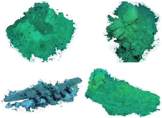 Overview of the global dense point clouds constructed from images of the four datasets: the Mermaid Dataset (top left), the Lost Freediver Rock Dataset (top right), the Flying Fortress Dataset (bottom left), and the Landingship Wreck dataset (bottom right).