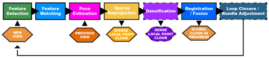MVS approaches evaluate all correspondences across clusters of images, reprojecting matched points from multiple views into a single 3D point. This results in a globally consistent dense reconstruction with minimal redundancy [19,20,21,22,23,24]. This approach is typically preceded by a sparse SfM framework that accurately estimates camera poses and forms coherent clusters for dense correspondence search. Some software packages or processing pipelines, such as COLMAP [25], visualSFM [26,27], or Metashape [28], integrate both steps, while others require the integration of sparse SfM modules (e.g., Theia [29], OpenMVG [30]) with dense reconstruction modules (e.g., PMVS/CMVS [31], OpenMVS [32]).