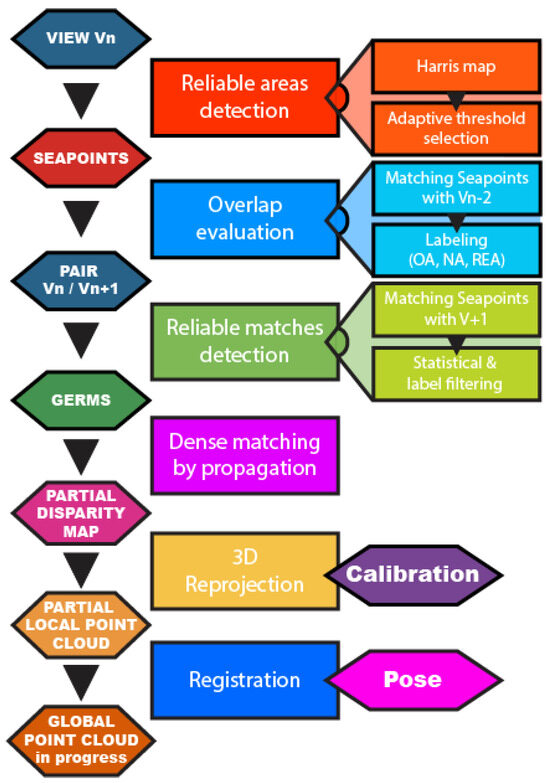 Diagram of the algorithm for generating a partial local dense point cloud from an image pair selected in the incremental flow to optimize spatial sampling and depth resolution. Its main steps include detecting reliable areas using SeaPoints, assessing the overlap rate and identifying the overlap area based on prior information, and performing dense matching by propagating matches in the vicinity of SeaPoints outside the overlap area to obtain a partial disparity map. The resulting dense points can then be reprojected into the 3D frame, as with sparse points within the SfM framework, to form a partial local dense cloud that is subsequently aligned with previous local clouds.
