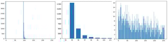 When the number of points exceeds the minimum of the target interval, we check to ensure that this count does not exceed the maximum value of the target interval. Since Harris values are not distributed linearly, they tend to appear in clusters of varying sizes, depending on the number of bins we have established for building the histogram. In such cases, we recalculate the histogram for the values located between the current bin’s bounds to achieve a finer distribution of this cluster of measures, and we begin summing the bins again to refine the threshold. This recursive process can be repeated as many times as necessary to effectively separate the measure. An example of a histogram is provided in Figure 5.
