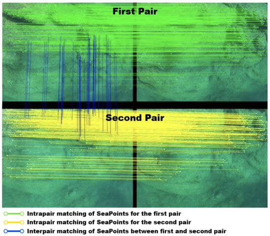 However, it is crucial to have a sufficient viewpoint difference between the two images to accurately estimate disparity and reproject the points in 3D. We can verify this criterion after performing intrapair matching (V + 2, V + 3) of the SeaPoints: if the mean norm of the matching vectors (see Section 2.4) is too low, it indicates that the viewpoint of V + 3 is nearly identical to that of V + 2 (which may occur in cases such as a stationary carrier, whether a robot or diver). In such instances, we opt for the next view, V + 4, to complete the pair.