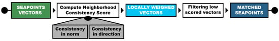 Flowchart illustrating the local statistical filtering applied to SeaPoint directional vectors for distinguishing inliers from outliers: the consistency score of each vector is incremented for each neighboring vector with a similar norm and direction. Vectors with low consistency scores are classified as outliers and are removed, resulting in a refined, robust list of matched SeaPoints.