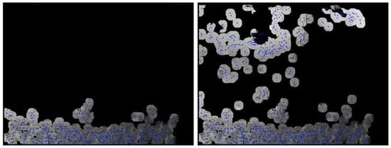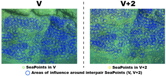 Identification of the overlapping area thanks to the establishment of an area of influence around the interpair SeaPoints. The blue circles indicate the influence areas around the interpair matches on a view V (left) and on its subsequent view V + 2 (right), delimitating the overlap area between the two views.