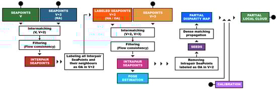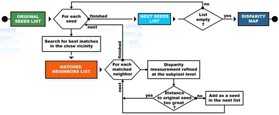 To reconstruct the local dense cloud, we begin with sparse matching between the two views of the pair (intrapair matching), followed by densification of this matching. Our densification criterion is based on spatial neighborhood principles [70,71,72,73]: if a point is close to another, their respective correspondents are likely to be as well, which helps limit the search area. The matched SeaPoints that serve as starting points for propagating the matching are referred to as seeds. The diagram of our propagation algorithm is shown in Figure 12.