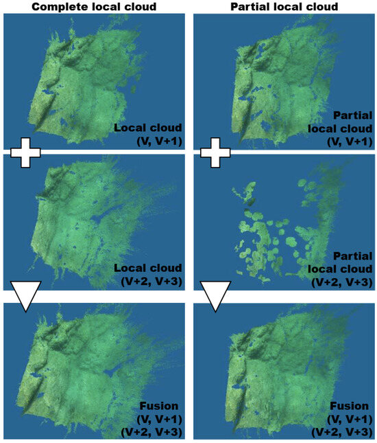 To address redundancy upstream, some methods propose frequency-based or spatial sampling techniques. In these approaches, dense reconstruction is not performed on all consecutive images (which are primarily used for pose estimation) but rather on selected key frames [52,53]. These key frames are chosen to minimize overlap between local clouds, either based on temporal frequency (e.g., selecting one frame every five) or spatial criteria derived from trajectory estimation. However, these approaches often rely on a priori assumptions, which can introduce artificial gaps in the reconstruction, potentially distorting the completeness of the final point cloud.