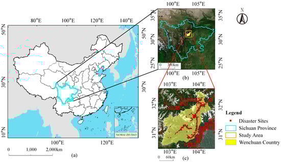 Geographic location of the study area and distribution of landslide disaster sites: (a) geographic location of Sichuan Province; (b) geographic location of Wenchuan County and the study area from Landsat 8 OLI; (c) distribution of landslide disaster sites from Landsat 8 OLI.