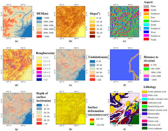 Nine predisposing factors of landslide diagrams in the study area: (a) DEM; (b) slope; (c) aspect; (d) roughness; (e) degree of undulation; (f) distance to the river; (g) depth of surface incision; (h) surface deformation rates; (i) lithology.