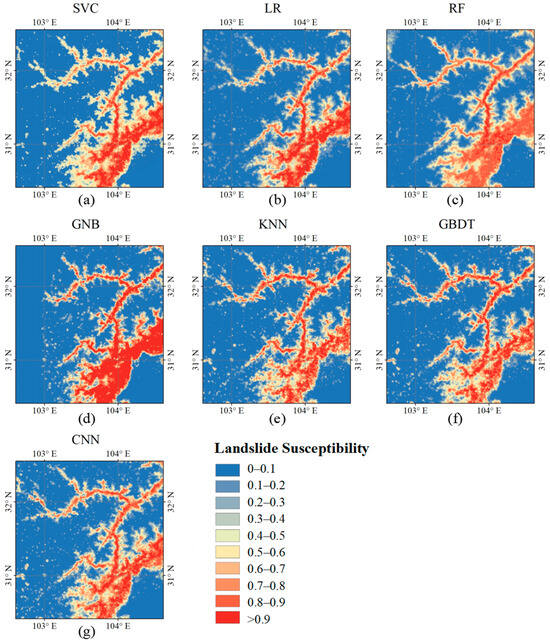 LS results of seven ML methods in the study area: (a) LS results of SVC; (b) LS results of LR; (c) LS results of RF; (d) LS results of GNB; (e) LS results of KNN; (f) LS results of GBDT; (g) LS results of CNN.