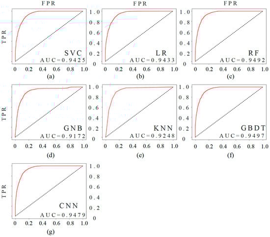 ROC curves of seven ML methods: (a) ROC curve of SVC; (b) ROC curve of LR; (c) ROC curve of RF; (d) ROC curve of GNB; (e) ROC curve of KNN; (f) ROC curve of GBDT; (g) ROC curve of CNN.