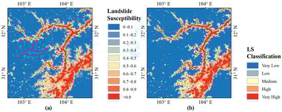 Subsequently, the seven ML results obtained were integrated into the GBDT model and subsequently retrained to generate a map of LS for the study area, as illustrated in Figure 5a. The numerical values represent the likelihood of landslide events, with values tending towards 1 signifying an elevated probability of occurrence. Specifically, areas colored in red denote a high probability of landslides, whereas areas depicted in blue reflect a low probability of such events. This study categorizes susceptibility levels based on the magnitude of the susceptibility results, designating the range of 0–0.2 as very low susceptibility, 0.2–0.4 as low susceptibility, 0.4–0.6 as medium susceptibility, 0.6–0.8 as high susceptibility, and greater than 0.8 as very high susceptibility. The classification of LS is illustrated in Figure 5b.