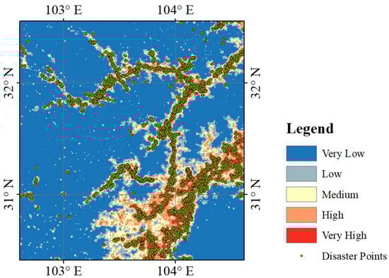 To further validate the accuracy of the LS results, this study conducted a comparison between the LS results and the distributions of disaster locations. The results are presented in Figure 6. The comparison reveals that the spatial distribution of areas with a high probability of landslides in the study area closely resembles the spatial distribution of disaster locations. The majority of the high-risk areas are situated near the Minjiang River, where the geological conditions are complex and characterized by intense neotectonic movements, fault development, frequent seismic activity, and geological disasters. Due to the action of river flow, the surface debris content increases and the river water system infiltrates the surrounding soil, leading to an increase in the soil water content. During seismic events or heavy rainfall, the accumulation of surface debris accumulation and soil water content increases, causing a decrease in friction and consequently increasing the likelihood of landslides.
