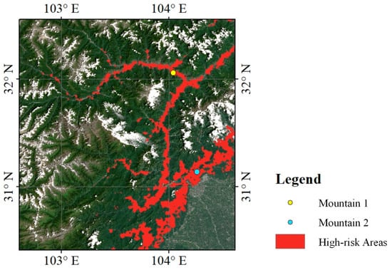 High-risk areas for landslides and selected mountains from two landslide simulations.
