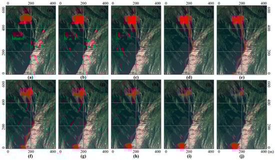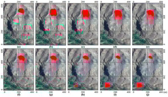 Landslide dispersion process for mountain 1: (a) initial landslide region; (b–j) 10–90 s landslide spread region.