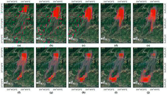 Landslide dispersion process in Shuicheng: (a) initial landslide region; (b–j) 10–90 s landslide spread region.