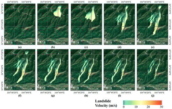 Landslide velocity of Shuicheng landslide: (a) initial landslide velocity; (b–j) 10–90 s landslide velocity.