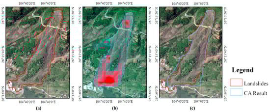 The results of the simulation were compared with the corresponding UAV image, and the results are illustrated in Figure 12. In this figure, (a) represents the actual inundation extent of the landslide event that occurred in Shuicheng, Guizhou Province, while (b) illustrates the inundation range of the landslide using the CA model. The simulation outcomes were superimposed on the images of the real landslide inundation zone, resulting in the composite representation depicted in (c). The simulation results derived from the CA model in this study closely align with the observed inundation area. The initiation of the landslide occurred at the midpoint of the hillside, subsequently advancing towards the base of the hill, with its movement being influenced by factors such as surface elevation, slope, and aspect. During the progression of the landslide, a localized area of uplift emerged on the hillside which subsequently influenced the landslide to disperse laterally. The simulation closely mimicked the observations captured in the actual imagery. The extent of simulated landslide dispersion was evaluated against the actual dispersion observed in landslides. The accuracy of the model was quantified using the Sørensen’s coefficient (SC), a statistical measure employed to assess the similarity between two samples. The SC is quantified on a scale from 0 to 1, where a value approaching 1 signifies a higher degree of similarity between the modelled outcomes and actual results [,]. The calculation yielded an SC value of 0.878. To further validate the simulation results, the kappa coefficient and overall accuracy were assessed, resulting in a kappa value of 0.891 and a total accuracy of 94.12%. These metrics indicate that the landslide simulation model established in this research has a high level of accuracy.