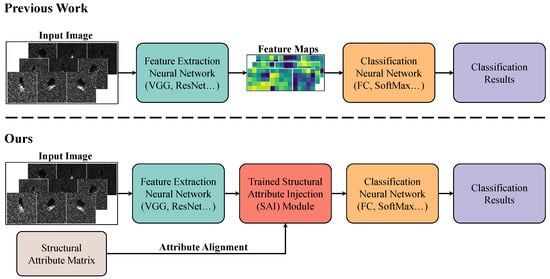 To address the aforementioned issues, we introduced the knowledge of structural attributes into the network for the first time and proposed a coding representation for structural attributes [13]. The architectural difference between the proposed approach and the previous radar target recognition network is shown in Figure 1. It should be noted that our proposed method can align the representation of the structural attributes of the input images with their features by using a higher-dimension trained Structural Attribute Injection module. Structural attributes typically refer to the components of the target object and the characteristics of these components, encompassing both geometric properties and the corresponding functional roles. By integrating this knowledge, we aim to create a more comprehensive understanding of the target’s structure and integrate it into the process of target recognition. Knowledge of structural attributes not only provides essential structural information about the target but also conveys correlations between different categories, facilitating better classification and recognition processes [14]. Hence, structural attribute knowledge serves as a crucial form of prior knowledge, enabling the model to focus on significant features within the data, which can lead to improved performance on specific tasks [15]. Furthermore, the approach to leverage structural attributes can enhance interpretability, allowing researchers to gain insights into how the model processes information. Despite the recognized importance of knowledge of structural attributes, research utilizing this framework remains relatively limited [16]. Therefore, our work not only contributes to the theoretical understanding of structural attributes but also opens new avenues for practical applications in the field.