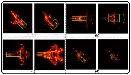 The green boxes show the examples of several substructures for the targets in ISAR images from the ISAR dataset. (a) The single vertical tail and the twin vertical tails (aircraft3 and aircraft2 with a pitch angle of 90° and an azimuth of 60°); (b) The single-engine and the twin-engine (aircraft1 and aircraft2 with a pitch angle of 75° and an azimuth of 0°); (c) The circular nose and the diamond nose (aircraft4 and aircraft5 with a pitch angle of 75° and an azimuth of 0°); (d) The aircraft without Blended Wing Body (BWB) and with BWB (aircraft2 and aircraft4 with a pitch angle of 90° and an azimuth of 47°).