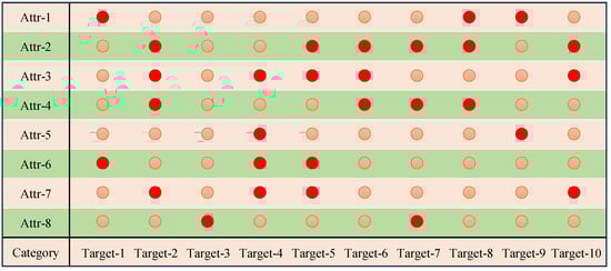 The illustration of the extracted structural attribute matrix for Dataset (1). The red circles represent the presence of the structural attribute, while the pink circles represent the absence of the structural attribute.