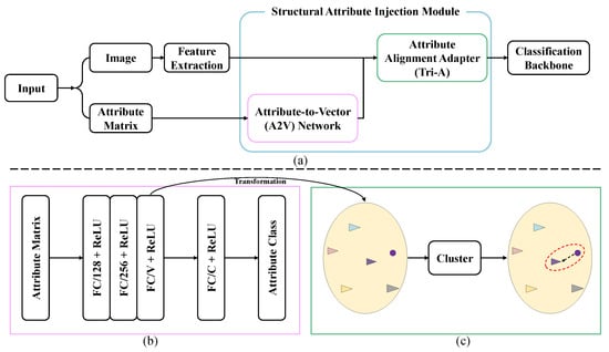 The Structural Attribute Injection (SAI) module consists of an Attribute-to-Vector (A2V) network and an Attribute Alignment Adapter (Tri-A), as illustrated in Figure 5. The primary function of the A2V network is to map structural attributes into a predefined structural space, thereby creating a high-dimensional representation of these attributes and enabling the network to effectively capture the structural features of the target. The Tri-A aligns the image samples with the nearest structural attribute representations in the structural space, which can help the network to obtain precise attribute representations for the image samples. This method not only enhances the correlation between the samples and their corresponding structural attributes but also ensures the effective transmission of structural information.