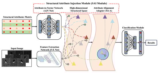 The proposed general Structural Attribute Injection (SAI) module can effectively integrate structural attribute knowledge into deep learning networks, enhancing radar target recognition. The overall framework of the pipeline is shown in Figure 7 and consists of three main components: the Feature Extraction Network (F-E Net), the SAI module, and the classification module.