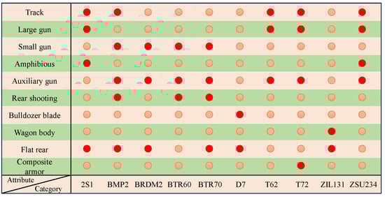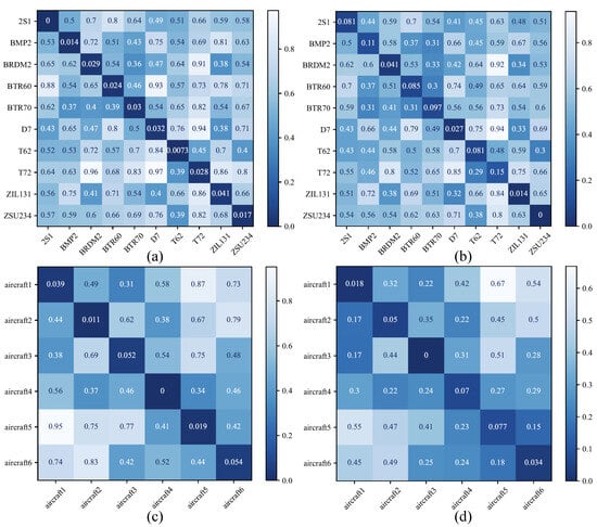 For clarity, different shades of color were used to represent the variations in the distance between the samples and the structural attributes. As evident in Figure 10, samples cluster near the structural attributes of their corresponding categories, indicating that the network can effectively align the features of the samples with their respective structural attributes. The smaller the distance, the higher the similarity between the sample and the target category. For example, in Figure 8, the structural attributes of T62 and T72, as well as those of BTR60 and BTR70, are closest to each other, reflecting their actual structural similarities. Similarly, in Figure 8, aircraft1 and aircraft3, as well as aircraft5 and aircraft6, show closer distances, further validating the effective reasoning ability of the network among structurally similar categories. Based on these observations, we can conclude that the proposed SAI module indeed possesses reasoning capabilities. The module can map uncertain samples to categories with similar structural attributes, resulting in more accurate target recognition. This reasoning ability is particularly critical under few-shot conditions, significantly enhancing the network’s generalization ability and recognition performance when data are limited.