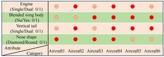 To effectively utilize the structural attributes within the algorithm, we model them using one-dimensional vector encoding, transforming the structural attributes into numerical representations suitable for input into the model. This process involves defining the encoding of structural attributes. Specifically, we represent the presence or absence of substructures using binary encoding, as shown in Figure 4. Each substructure is assigned a specific binary value, where ‘1’ indicates the presence of the substructure, and ‘0’ denotes its absence. This simple yet effective encoding approach not only enhances data processing efficiency but also ensures the accurate transmission of structural attribute information during subsequent model training, helping the model better understand and leverage these attributes [39]. Therefore, we define , where , C represents the number of categories. Let A be a binary vector where ‘1’ indicates true (the presence of the structural attribute) and ‘0’ indicates false (the absence of the structural attribute). Using structural attributes to encode the categories, we can establish connections between the different categories, thus facilitating the effective injection of structural attributes into the model.