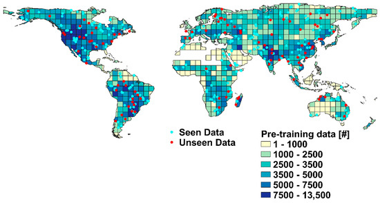 Study area covering 89% of the Earth’s surface. Markers show the location of manually labelled samples of 0.15° × 0.15°, (~15 × 15 km). Seen data were used for training, validation and testing. Unseen data are spatially distinct from the seen data and was only used for testing. Graduated background shows the number of pre-training data samples extracted from modelled results for each 5° × 5° grid cell.